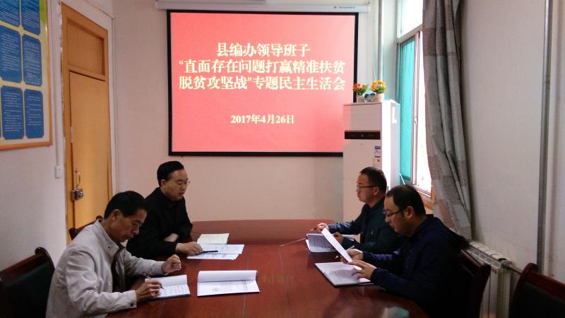 4月26日下午,县编办领导班子召开“直面存在问题打赢精准扶贫脱贫攻坚战”专题民主生活会。